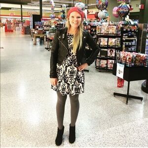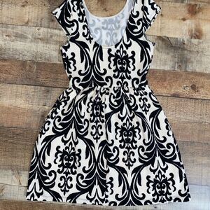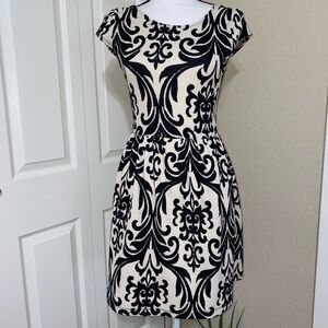 This adorable pull on style dress is by buttons. Beautiful cream and black fleur de lis pattern all over. Looks new.