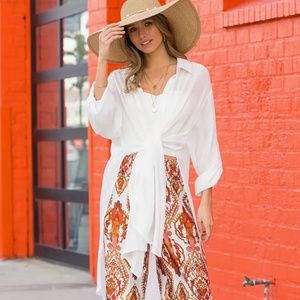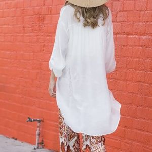 A woven longline shirt featuring a basic collar, buttoned closures down the front, long sleeve with roll tab cuffs, dropped shoulders, side seam slits, over sized fit. Style can be tied up front as a shirt or loosened up and worn as a cover up.