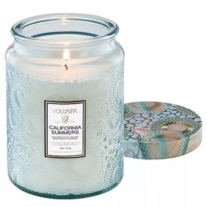 Indulge in the serene aroma of California Summers. This Voluspa candle features a textured cream jar with elegant gold accents. Perfect for adding a touch of luxury to your home.