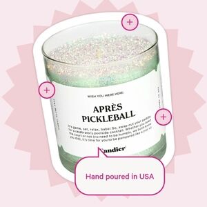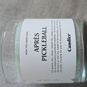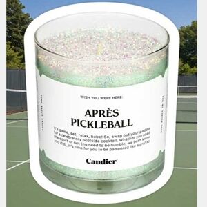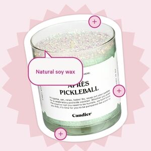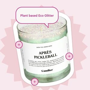 Enjoy the Candier Après Pickleball candle with a refreshing scent. Features plant-based eco glitter on top. Perfect for relaxation.