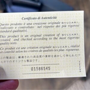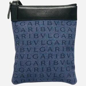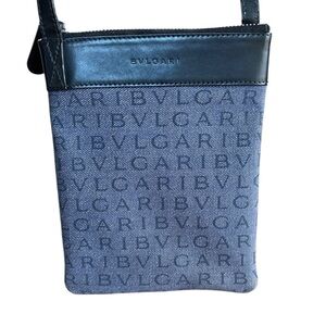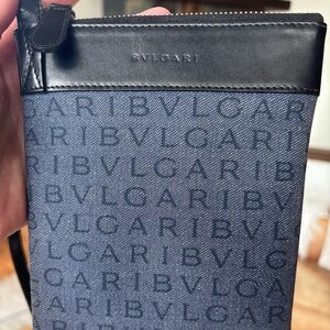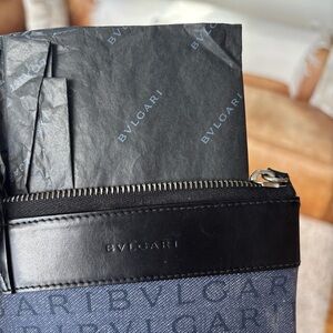 Sophisticated Bvlgari pouch in black and navy. Features signature branding.