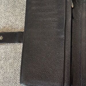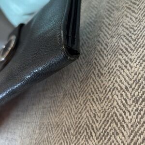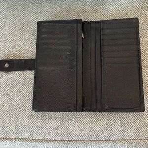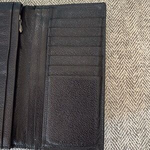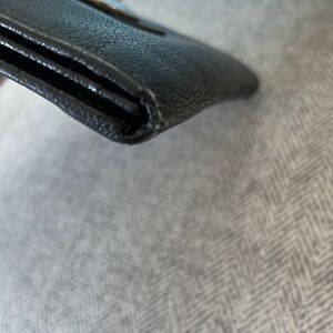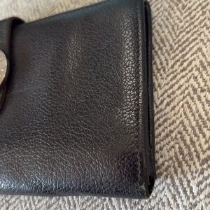 BVLGARI black leather wallet. Some wear on corners and coin residue