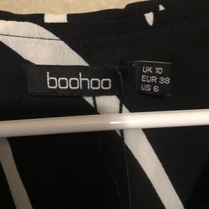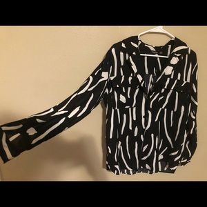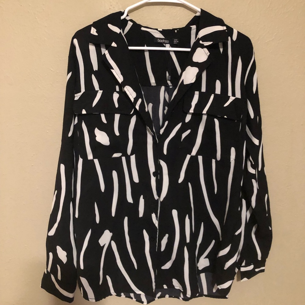black and white button up top worn once as an oversized over the shoulder with a bralette:) size 6 , large or x-large