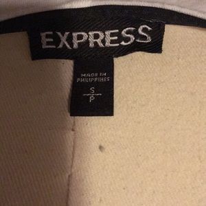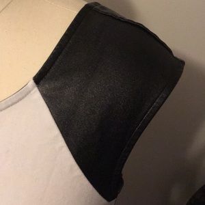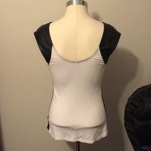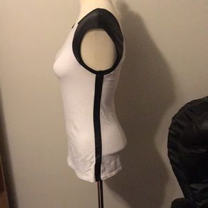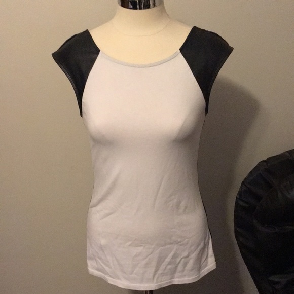 White top with faux leather shoulders and strip going down the side.