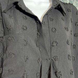 The B Women's Polka Dot Mini Dress Tunic is a stylish and versatile addition to any wardrobe. Featuring black textured fabric polka dots, this blouse can be dressed up or down for a variety of occasions. With a collared neckline and roll-tab sleeves, it provides a classic and timeless look that will never go out of style.