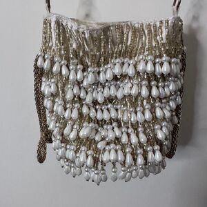 White pearl and gold beaded mini bag with long chain strap or wristlet option.