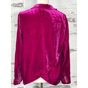 Vibrant raspberry pink Velvet Tulip Back Blazer from Anthropologie. Open front style; unlined; notched lapel; hip pockets (sewn closed); 4 functioning buttons on cuffs; elegant tulip draped in back. Viscose/Nylon. Hand wash recommended. Approx 21" armpit to armpit, 27" shoulder seam to hem, 25" sleeves.