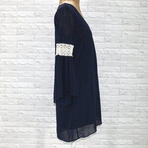 BY & BY Dress Mini Chiffon Lace Sheer Overlay Long Bell Sleeve Navy Blue Flowy M