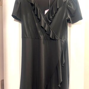 Chic black dress with asymmetrical ruffles. Short sleeves and elegant design. Perfect for any occasion.