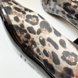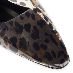 Fabric: Vinyl. Leopard print. Cushioned footbed. Suede covered chunky heel. Round toe. Rubber heel patch at leather sole. Made in Portugal. EU 35 or US5 equivalent. A classic silhouette gets a fresh update in these By Far leopard print pumps with a super-soft vinyl upper.