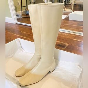Only worn once for a night out. Outsole got a bit scuffed from walking around but besides that these boots are in perfect condition. Looking for someone who will show these beautiful boots off more because I won’t wear them nearly enough. They are a size 35 EU and the color is off white. Comes with box and dust bag.