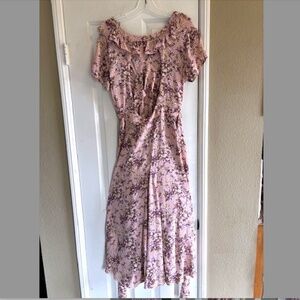 ** Yellow Floral Dress on Model and Mannequin is the Same Style From the Brand in a Different Colorway and is Just Meant to Help Show Fit & Style. Dress For Sale is Soft Pink/Purple Floral One Shown Hanging and Lying Flat.