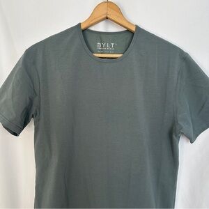 BYLT Shirt Mens Medium Blue Drop Cut Lux Premium Basics Curved Hem Solid Casual. There’s a tiny white mark on the sleeves. Please review photos. Still in good preowned condition. Great quality.