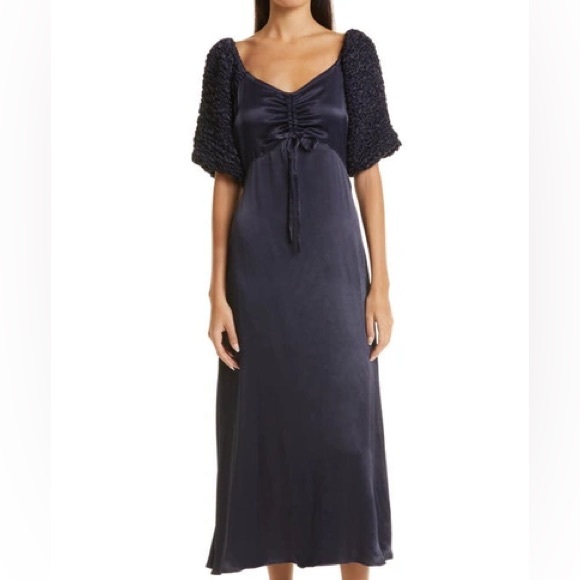 A glossy satin gown takes inspiration from vintage silhouettes with ruched sleeves and a tied bodice, all in an enchanting midnight-blue hue.