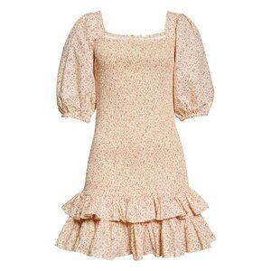 – Sweet smocking shapes this puff-sleeve frock covered in romantic blooms with a layered ruffle hem