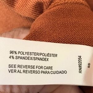 BYdesign Women's Rust color pullover sweater. Size Large. 3/4 sleeve, round neckline embellished with square goldtone metal tabs. Polyester rayon blend, machine washable. Good preowned condition.Bust: 41", Length: 26"