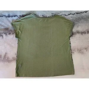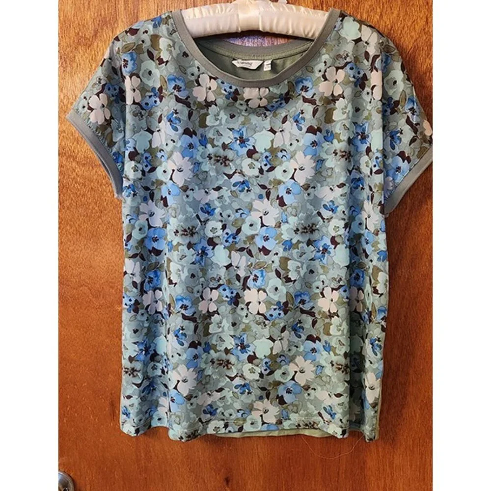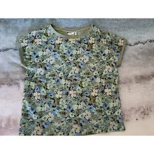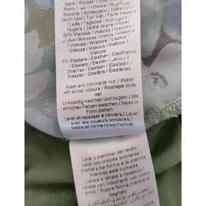 Pretty blue flowers bloom on a spring green background. The back is solid green. Size Medium. Wash inside out, reshape wet and dry flat. I typically toss it in the dryer on delicate when it's almost dry and the wrinkles just disappear.