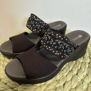 Cue the fireworks. Light the way in crazy-comfy women's sandals with standout details. Plus, get an extra lift when you slip into these wedge sandals for women. Stretch fabric upper with a round toe. Slip on fit. Woven stretch fabric strap with braided + rhinestone details. BZEES Cloud Technology: Designed so you'll feel weightless, energized and free. Air-Infused Outsoles: Bzees are ultra-lightweight, soft, and bouncy. Dynamic Stretch Uppers: Stretch fabrics move and groove with you. Free-Foam Footbeds: Crazy-cushy anatomical insoles. Comfort Cone Gel: Get that extra "ahhhhh factor" with heel impact shock absorption and cushioning in all the right places. Anti-Microbial and Odor Control technology. 2.25-inch wedge heel. Machine Washable: Wash on cold and air dry.
