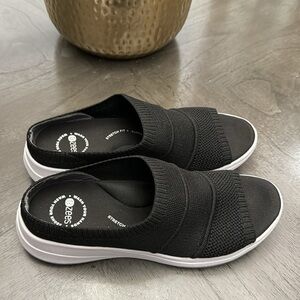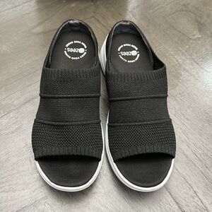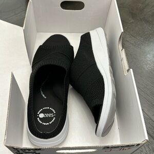 Feel the breeze in this machine-washable slip-on sandal with premium comfort and a peep toe. Stretch engineered knit upper. Open toe. Slip-on fit. Algae-based foam layer under the insole. BZEES Cloud Technology: Welcome to Cloud 9. Dynamic Stretch Uppers: Free and natural movement is finally here. Designed so you'll feel weightless, energized and free. ComfortBoost™ Foam: Our most premium foam with unbelievable rebound, luxe cushioning, and comfort that never quits. Comfort Cone Gel: Get that extra "ahhhhh factor" with heel impact shock absorption and cushioning in all the right places. Free Foam Footbeds: Your feet need beds just as much as the rest of your body does. SoCush Memory Foam arch support. Air Infused Outsoles: You'll feel like you're walking on, well, you get the idea. 1.25-inch wedge heel. Machine Washable: Toss 'em in the wash and you're good to go.
