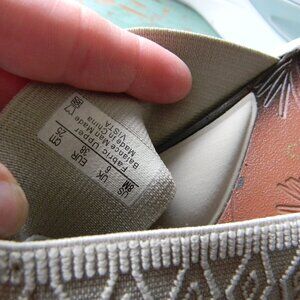BZEES WM'S COMFORT SPORT SLIP-ON SANDALS WEDGE SZ 8M, TAN EMBOSSED CRISS-CROSS FRONTS ON A WHITE/GRAY PERFORMANCE SPORT SANDAL WEDGE MEASURING 3"TALL IN THE BACK. COMFORT FOOTBED. GOOD USED CONDITION