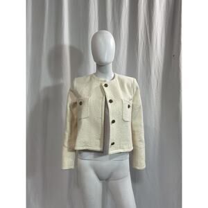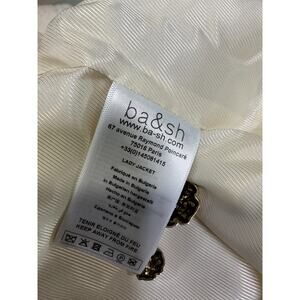 Ba&Sh 'Meredith' White Short Patch Pocket Jacket Size S: round neck, long sleeves with triple-button cuffs, front gold-tone button closures, chest patch pockets with decorative gold-tone button detail, allover textured fabric, lined.