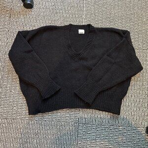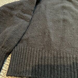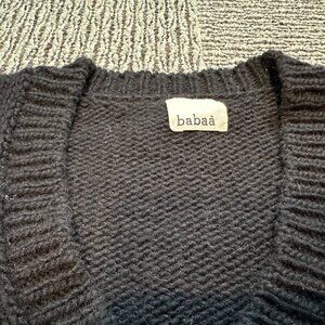 This is a super cozy black wool v-neck sweater. I am not the first owner. It was sold to me as No. 29, but based on the width of the cuffs and hem, I think it's probably a No. 75. (The stock photo is a No. 75.) The measurements do not completely align to either one on the Babaa website, so please read my description carefully. (It has great proportions!) This is very good overall condition. There is very minor pilling (see close-up photo). No odors or damage to the sweater. Non-smoking home. Measurements when laying flat: 30" pit to pit 22" shoulder to hem 24" across hem Such a great wardrobe staple to get you through the rest of the winter!