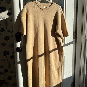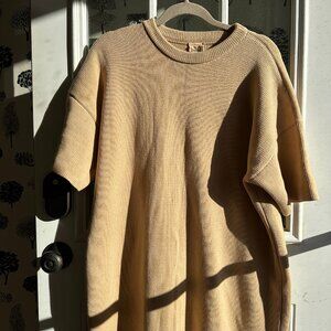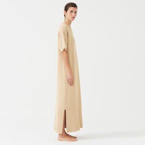Long crew neck cotton dress with side slits. We knitted these in a special texture that feels so flattering for all shapes – the same special local cotton but that bit thinner with such a brilliant weight. Knitted in our local cotton. A very special yarn grown, harvested and spun in Andalucía, Southern Spain. All natural, soft, robust and full of personality. This is one of our ECO COLOURS: we garment dye our natural cotton using the latest technology – 60% less water, no bleaching, no toxic waste and environmentally friendly colouring. Vegan friendly.
