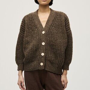 From Babaa: Pure wool cardigan. A very comfortable and versatile style in a chunky texture with a very easy low neck line. Knitted in our local wool. This wool is very special as it all comes from our sheep, shepherds and artisans in Northern Spain. This shade is non-dyed, made directly with the fleece from our sheep. Our local wool feels like a hug. It is a strong and very pure yarn that softens and adapts to you over time. A very resistant and classic wool, perfect for timeless knitwear. We care about animals and we can assure you that all local sheep providing this wool have been treated with care. Made in Spain Materials: 100% eco Spanish wool One Size. SOLD AS IS.