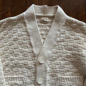 Textured cotton cardigan with a v neck line, dropped shoulders and pockets to keep all good things. Made from our local cotton. A very special yarn grown, harvested and spun in Andalucía, Southern Spain. All natural, soft, robust and full of personality. This is the natural shade of the cotton – not dyed, not bleached.