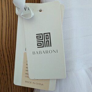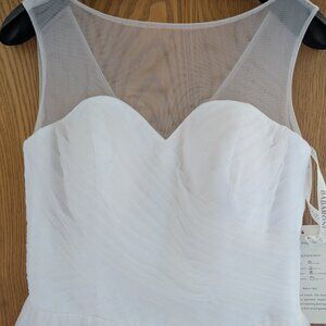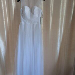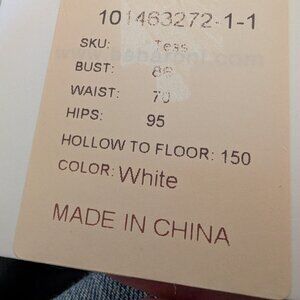 Never worn white formal dress, size 4. Floor length. Tag gives measurements in centimeters. In inches: 34in bust, 27.5in waist, 37.5in hips, 59in hollow to hem.