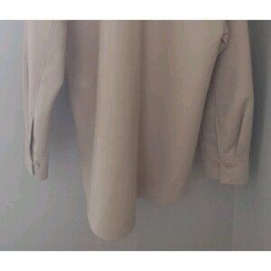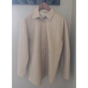 Babaton Aritzia Shirt Jacket, thought to be the Pelli Shirt Jacket. Size Small. Light Tan. Button Down. Vegan Leather. Classic, minimalist, closet staple, quiet luxury. In nice, preowned condition. Measures approximately 21" pit to pit, 28" shoulder to hem.
