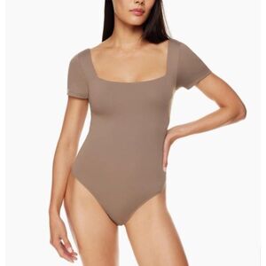 "A cult classic for a reason. This is a squareneck shortsleeve bodysuit with a thong-cut bottom and double-layer fabric for a supportive fit. It’s made with Aritzia’s Contour — luxe, ultra-flattering fabric coveted for its smoothing effect and second-skin feel. Nothing more essential. Hidden Hold Loops keep your bra straps in place and out of sight."