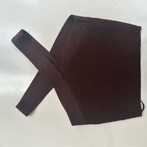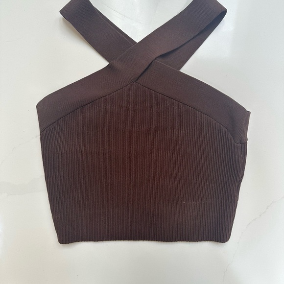 Stylish chocolate tank with cross-strap design. Ribbed texture adds elegance. Ideal for versatile wear.