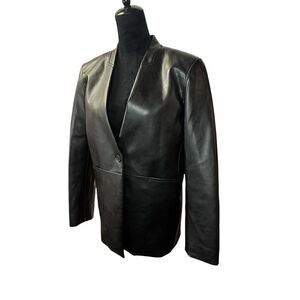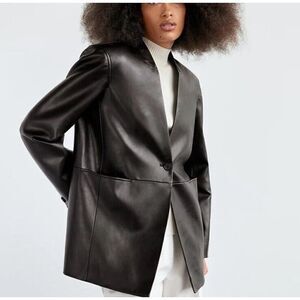 Chic dark leather jacket. Minimalist design. Versatile style.