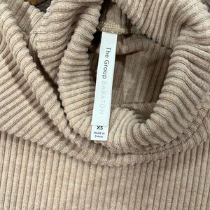 Chic ribbed turtleneck sweater dress in a soft tan shade. Ideal for cozy wear.