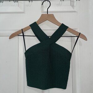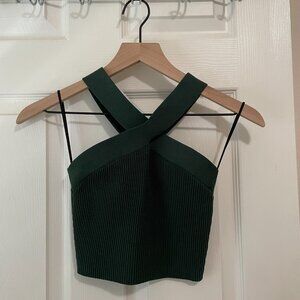 This is a fully fashioned halter top with a cross-front neckline and body-hugging fit. It’s made with Sculpt Knit — Babaton’s signature figure-smoothing yarn. The perfect amount of stretch hugs in the right places to shape and sculpt your form. This version is constructed with a Jersey stitch for a soft drape and a smooth, flat feel.