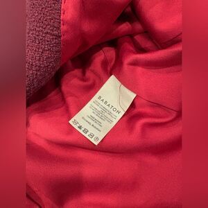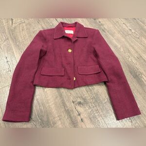 Elegant Babaton blazer. Rich burgundy color. Features gold buttons. Perfect for formal occasions.