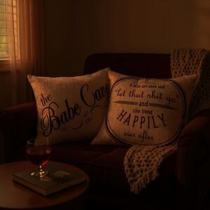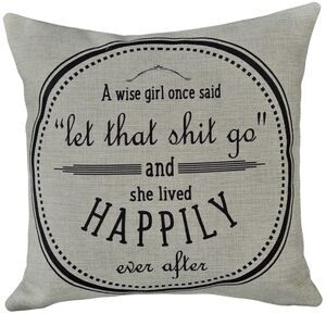 Decorative motivational double-sided 18x18 handmade throw pillow in natural linen with black text. “Babe Cave” on one side; “ a wise girl once said, let that shit go, and she lived happily ever after” on reverse. Medium weight zippered linen cover has burlap look with rustic feel is removable and machine washable. New in packaging.