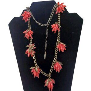 BabelBar Pink Coral Bead Cluster Tassel Necklace Gold Tone Chain Leaf.