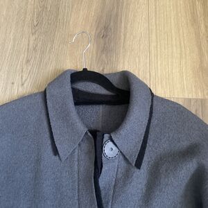 Elevate your wardrobe with this stunning Babette sweater jacket. Made from 100% boiled wool, this color block jacket in black and gray features a relaxed fit with long sleeves and a collar.