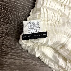 Vintage Babette sculpted top in ivory with the brand’s signature micropleated plisse texture. Features a structured fit through the waist, softly ruffled collar, long sleeves, and matte black buttons. Made from a lightweight 100% polyester microfiber with Babette’s iconic permanent pleating, produced in the USA. This piece carries the architectural, art-to-wear style the brand is known for.