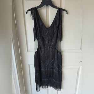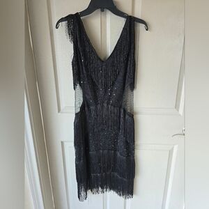 Babeyond Fringe Beaded Dress M Women Black Flapper 1920s V Neck Sequin Y2k