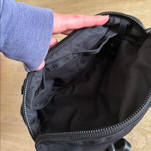 black nylon belt bag with multiple zippered compartments. Fanny pack. Great condition!