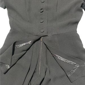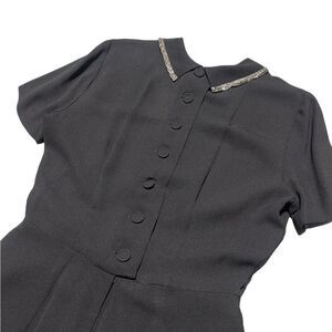 This dress is beyond exquisite. I promise the pictures do not do it justice! Become Clyde’s Bonnie in this stunning high quality black crepe with outstanding beaded trim around the Peter Pan collar and at the peplum hipline. The dress is unlined with a back zipper that stops at the small of the back leading to a beautiful button detail down the spine to finish off the closure. Existing belt loops in tact if you want to add a belt to finish off the look.