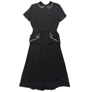 Babs Junior 1940s True Vintage Black Crepe Peplum Dress with Beaded Trimming