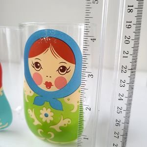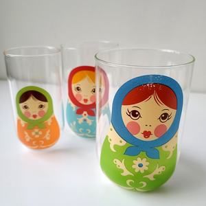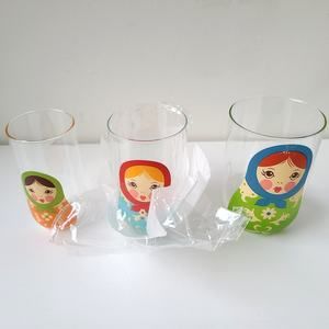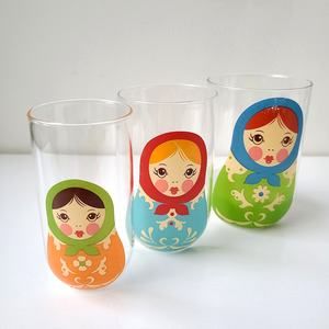 These space-saving, rounded nesting tumblers are made of hand-blown glass and decorated with cute, colorful matroshki characters. The set includes three different sizes with capacities of 8, 10, and 14 fluid ounces. Glass is delicate and fragile.