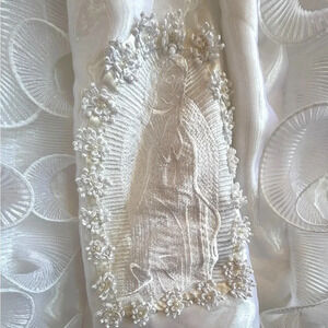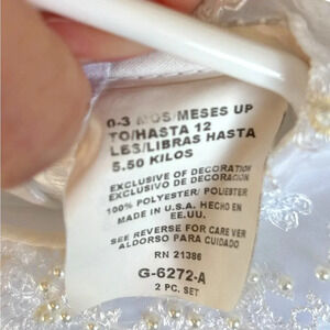 0-3 months up to 12 months. 90% certain Alegria brand. Exquisite embroidery of Mary amid tasteful beading, scalloped layers and tulle. Worn once for baptism. Missing baptismal head cover, reflected in price. No noticeable baptismal gown imperfections on visual inspection. Polyester. Photos show slight blue tinge to dress which is only from lighting and not true to the pure white dress.