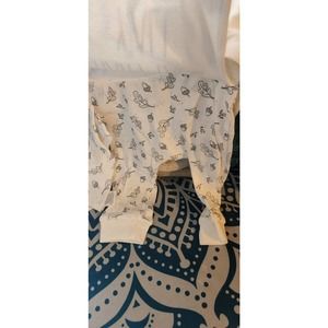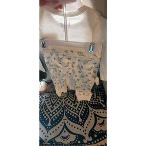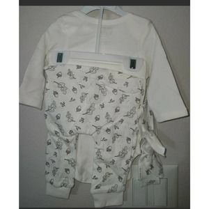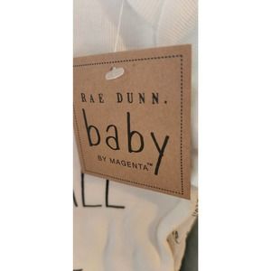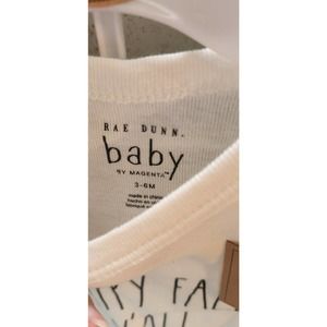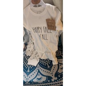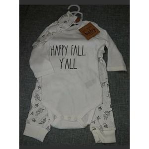 Baby Happy fall y'all 3-6 months Rae Dunn baby new with tags white 3 piece long sleeve onesie, headband and pants. The onesie says Happy Fall Y'all and the headband and pants are also white but have cute black outlines of leaves and acorns. This is a great set for a gift for a baby in your life, baby shower, or for your own baby this autumn. Great for fall pictures in the leaves or apple orchard!
