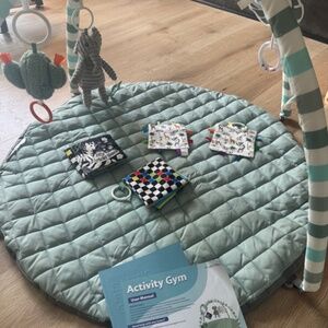 It includes a well-cushioned play pad with baby's first year guide and multiple learning tools that are detachable. Each book has sensory function including crinkles and squeaks.