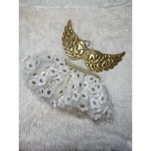 This sweet set includes a gold metallic angel wings accessory and a white tutu skirt with gold and white floral appliqués.